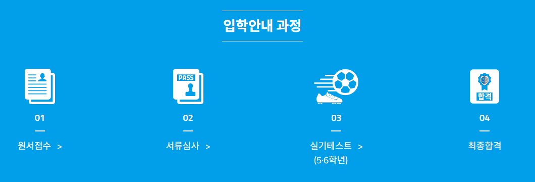 SON축구아카데미에 압학은 원서접수부터 서류심사, 실기테스트(5~6학년)를 거쳐 최종합격의 과정을 거쳐야합니다.