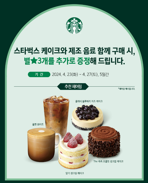 - 스타벅스 케이크와 제조 음료를 함께 구매시 별 3개를 추가로 증정해드립니다.