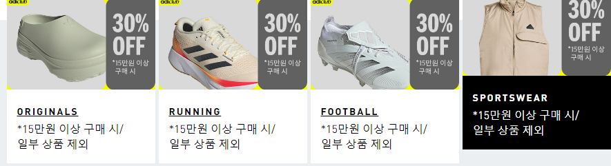 아디다스 오리지날, 아디다스 러닝, 아디다스 축구, 아디다스 스포츠웨어 대상으로 추가30%할인 받을 수 있습니다.