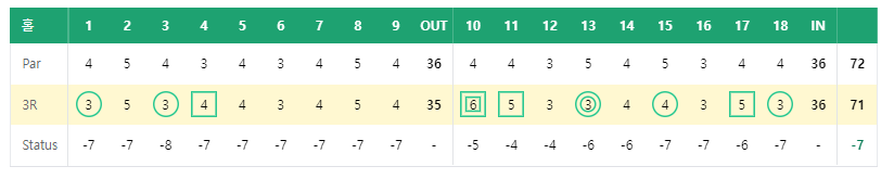 1라운드에서 6언더, 2라운드에서 이븐파, 3라운드에서 1언더를 기록해 현재 7언더로 단독선수