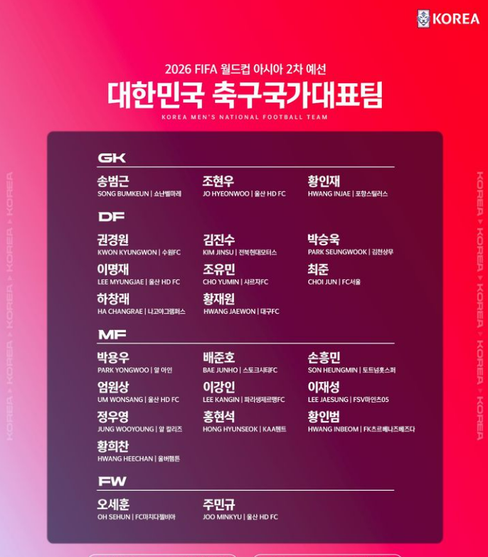 2026 월드컵 아시아 2차 예선 대한민국 대표팀 명단이 공개되었습니다. 새롭게 발탁된 선수들이 눈에 띕니다.